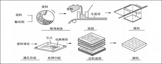 低溫共燒多層陶瓷(LTCC)是以陶瓷作為電路基板材料,利用無機(jī)陶瓷粉加上有機(jī)黏結(jié)劑混合成泥狀的漿料,經(jīng)過刮刀成型干燥后制成一張張的薄生胚,再利用網(wǎng)版印刷技術(shù)將電路印在上面,于各層打出上萬個(gè)通孔,內(nèi)外電極可分別使用銀、金等金屬,在攝氏850-900多度的燒結(jié)爐中,以平行式印刷涂布制程燒結(jié)形成整合式陶瓷組件。